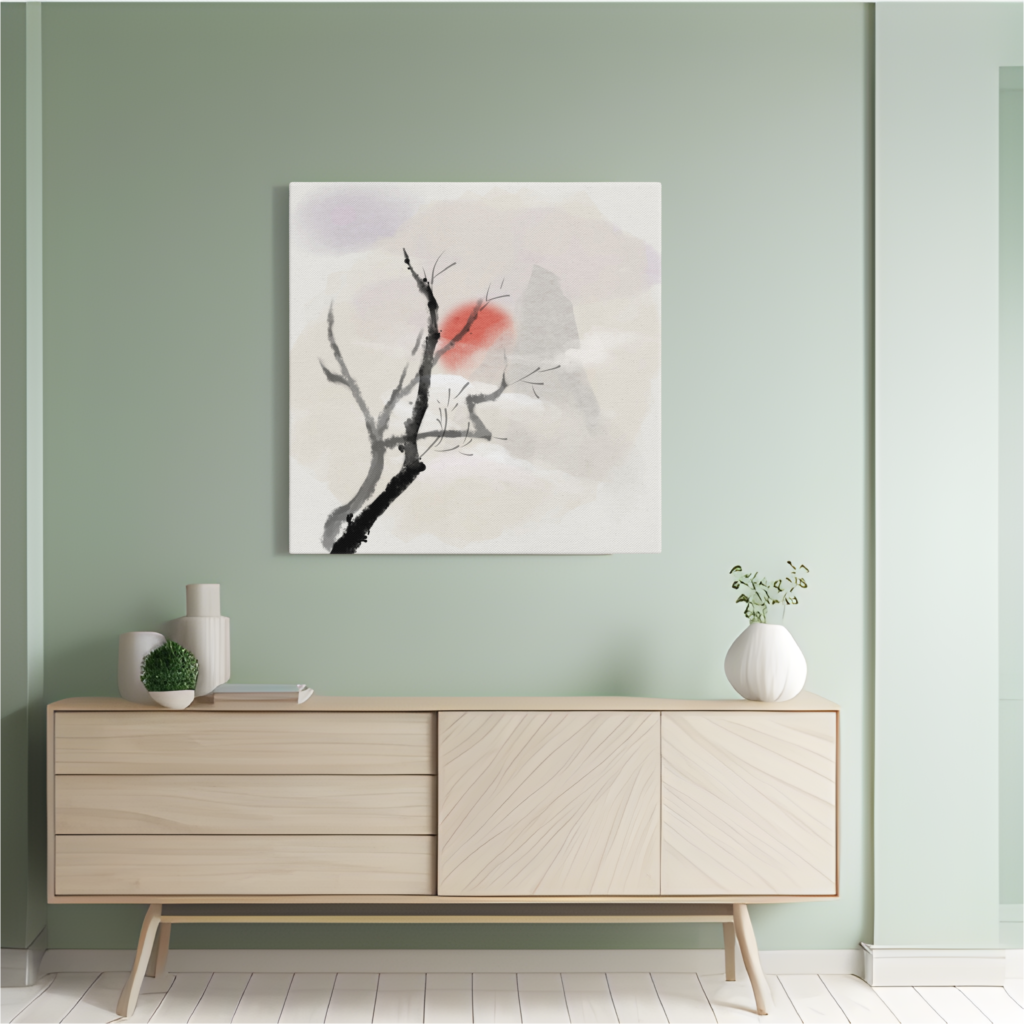 Look for art with clean lines, subtle gradients, or single-subject compositions. Abstract washes in neutral tones work well. So do simple botanical illustrations featuring one branch or leaf. The subject matters less than the composition’s clarity.
